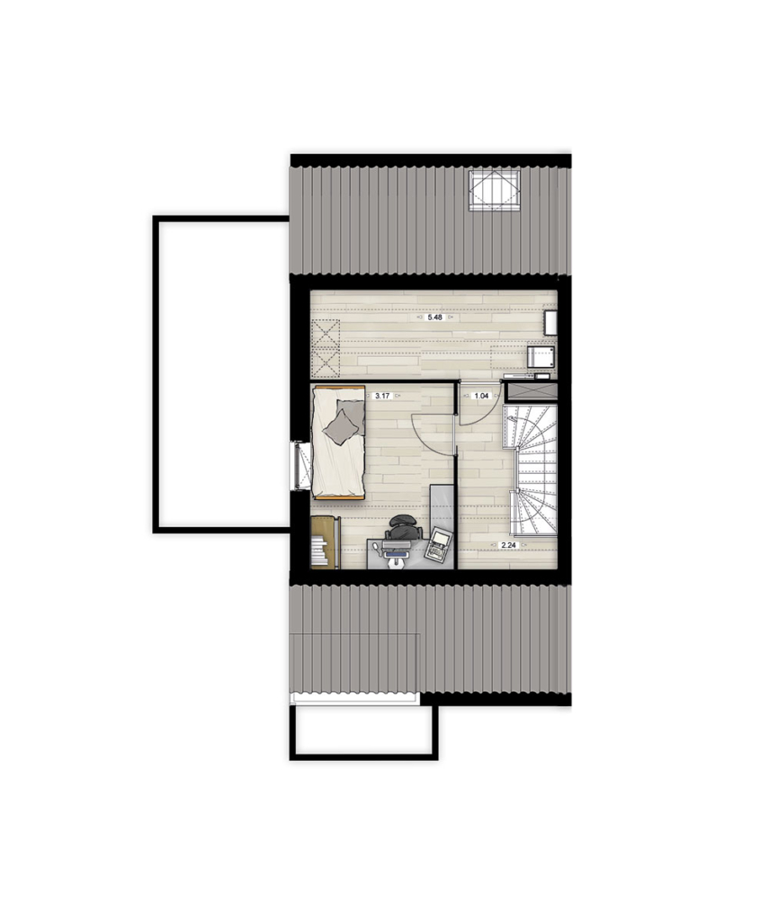 Op de tweede verdieping vind je nog een (slaap)kamer en de technische ruimte.