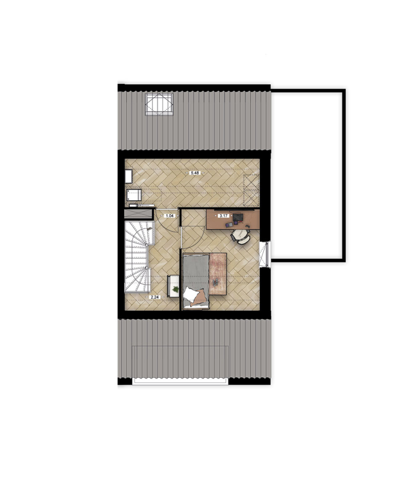 Op de tweede verdieping vind je nog een (slaap)kamer en de technische ruimte.
