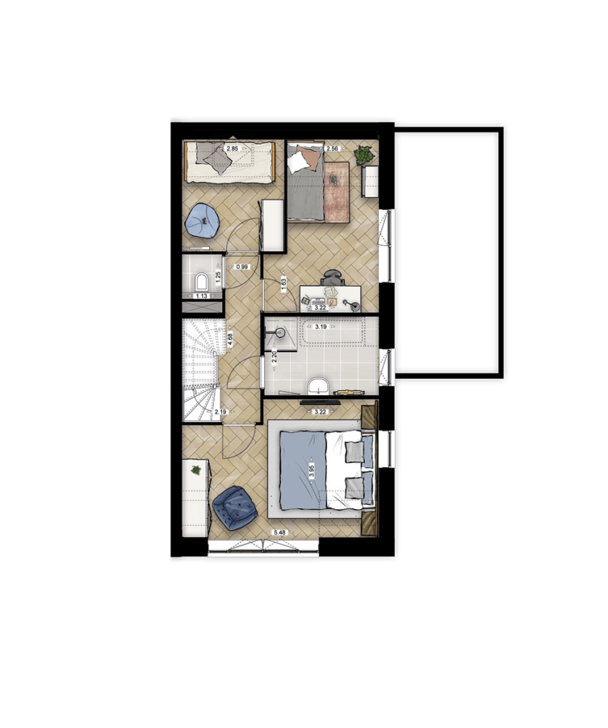Op de eerste verdieping zijn standaard drie slaapkamers met fijne raampartijen. Heb je liever twee grotere slaapkamers? Dat kan!
