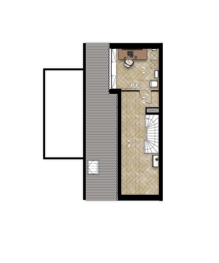 Op de tweede verdieping is er een mogelijkheid voor nog een (slaap)kamer, met daarnaast een aparte technische ruimte.